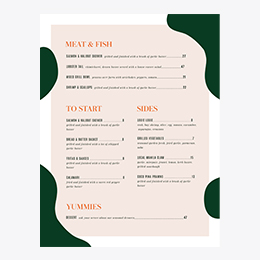 Our restaurant menu maker enhances your menu design with editable templates, pro fonts, graphics, and colors, resulting in beautiful cohesion and easy reading. Try free today!